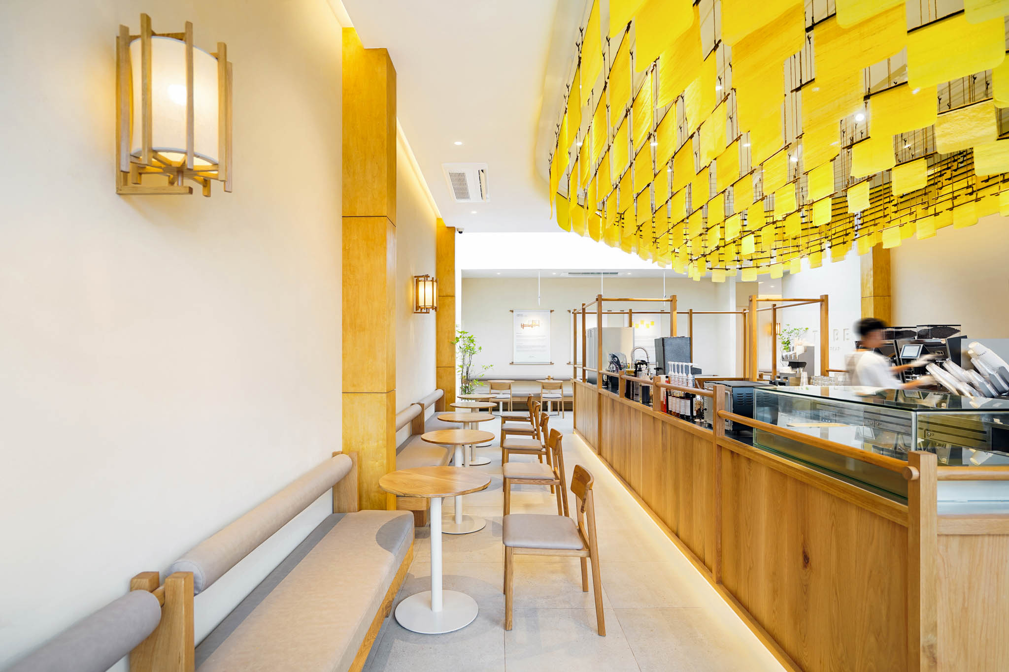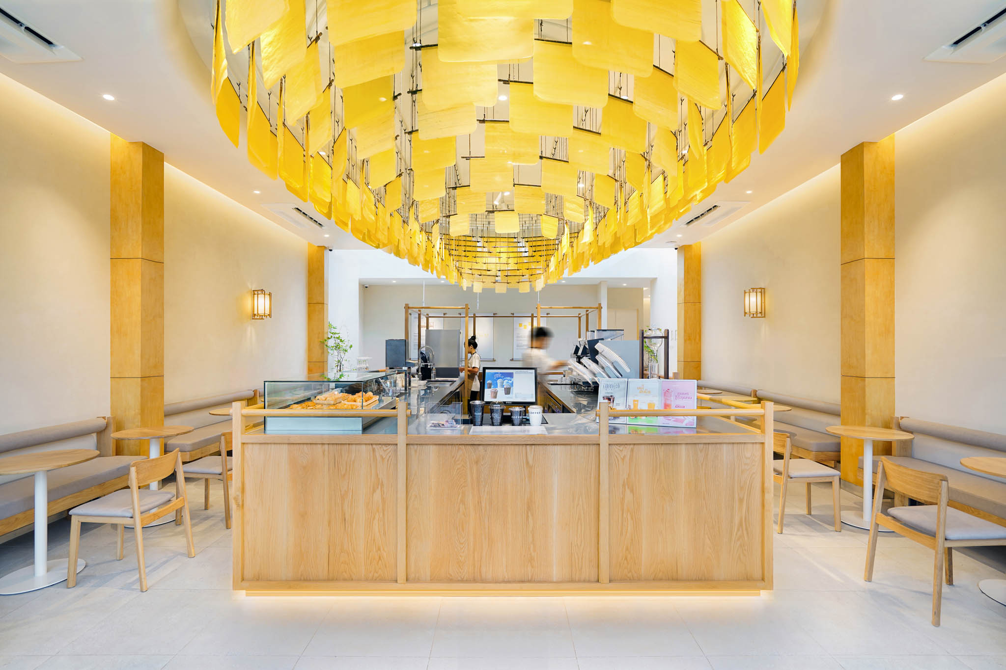 គំនិតនេះបានបង្ហាញខ្លួននៅក្នុងស្នាដៃសិល្បៈមួយដែលមានឈ្មោះថា Ceiling Installation—ដែលជាចំណុចកណ្តាលនៃចម្លាក់ដែលផ្សំឡើងពីសរសៃសូត្រពណ៌លឿងចំនួន ២៣៤ ដែលបានព្យួរចុះមក ដែលតំណាងឱ្យអត្តសញ្ញាណរបស់ម៉ាកហាងកាហ្វេ បំណែកនីមួយៗមានទំហំ និងកម្ពស់ខុសៗគ្នា ដើម្បីធ្វើត្រាប់តាមលំហូរនៃសរសៃសូត្រនៅលើកីតម្បាញ។ ទាំងជានិមិត្តរូប និងការជក់ចិត្តនៃស្នាដៃនេះបានទាក់ទាញភ្នែកឱ្យមើលទៅលើ និងជំរុញឱ្យមានការគិតដ៏ស្ងប់ស្ងាត់។