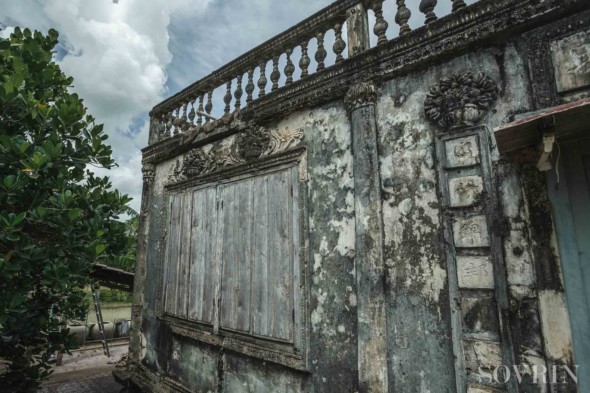 បើមើលពីបរិវេណខាងក្រៅ ផ្ទះនេះមានសភាពចាស់ទ្រុឌទ្រោមបែកបាក់ដោយអន្លើជាពិសេសផ្នែក ខាងមុខដែលសង់អំពីស៊ីម៉ង់ត៍ ប៉ុន្តែវានៅតែជាភូមិគ្រឹះពីអតីតកាលដ៏អស្ចារ្យមហិមាដែលនៅតែឈរសង្គ្រឹង កណ្តាលវាលស្មៅហ៊ុមព័ទ្ធដោយរុក្ខជាតិតូចធំដែលដុះនៅជុំវិញ។ លក្ខណៈពិសេសនៃផ្ទះបុរាណនេះគឺវាជា ផលសំយោគនៃសិល្បៈស្ថាបត្យកម្មបីសាសន៍ បារាំង ចិន ខ្មែរ ដែលពិតជាកម្ររកបានណាស់នៅក្នុងស្រុក យើងសព្វថ្ងៃនេះ។ ក្រឡេកមើលឲ្យចំពីខាងមុខ ផ្ទះនេះពិតជាចម្លែកព្រោះផ្នែកខាងមុខត្រូវបានសាងសង់ រាងទ្រវែងបួនជ្រុងស្រដៀងនឹងផ្នែកខាងមុខនៃរោងភាពយន្តពីសម័យមុន។ នៅមុខមាត់ទ្វារចូលផ្ទះ មានរាន ហាលតូចមួយដែលមានជើងទៀនបង្កាន់ដៃប្រកបដោយក្បូរក្បាច់តាមបែបរចនាបថសម័យអាណានិគមនិយមបារាំង។ រានហាលនោះស្ថិតនៅចំកណ្តាលជណ្តើរពីរសងខាងដែលមានរាងកោង ហើយមានកាំចំនួន១៥ ក្នុង ជណ្តើរម្ខាងសម្រាប់ឡើងទៅកាន់ទ្វារច្រកចូល។
